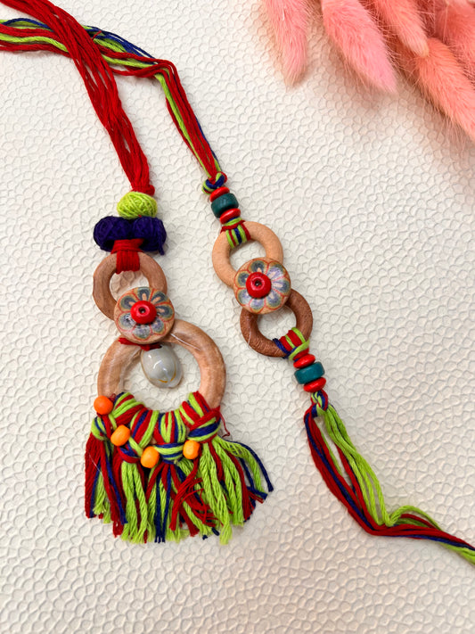 Wrap Shap Designer Bhaiya Bhabhi Rakhi Lumba Set - Model PLB2 with Rajasthani Theme & Bhai & Bhabhiisa Script
