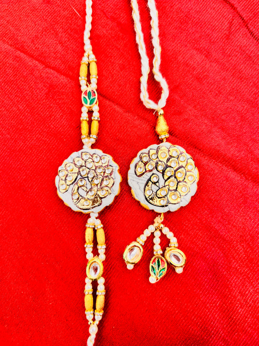 Wrap Shap Designer Bhaiya Bhabhi Premium Kundan Work Rakhi Lumba Set - Peacock Design on Agate Stone with Roli Chawal