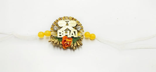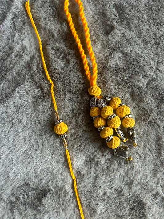 Wrap Shap Designer Bhaiya Bhabhi Rakhi Lumba Set - Yellow Macrame Thread Design with Roli Chawal