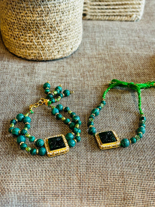 Wrap Shap Designer Bhaiya Bhabhi Rakhi Lumba Set with Green Beads and Emerald Resin Stone - Model RM317, Includes Roli Chawal