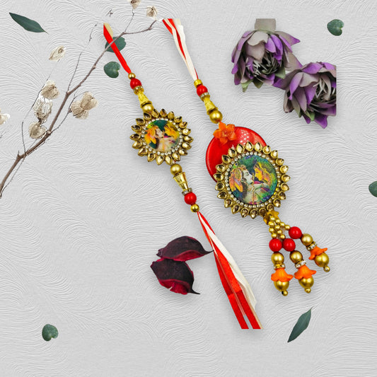 Wrap Shap Designer Bhaiya Bhabhi Rakhi Lumba Set - Model SQ32 with Radha Krishna Theme & Roli Chawal
