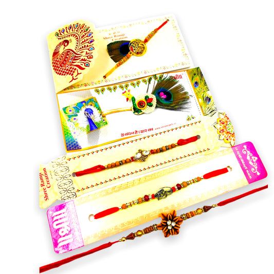 Wrap Shap Combo 8: Set of 5 Premium Designer Rakhis with Roli Chawal - Peacock, Om, Flower & More