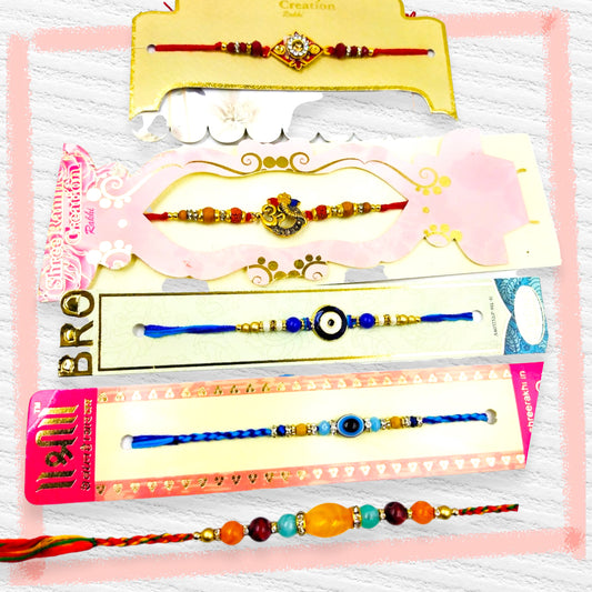Wrap Shap Combo 9: Set of 5 Elegant Designer Rakhis with Roli Chawal - Evil Eye, Om, Ganesh & More
