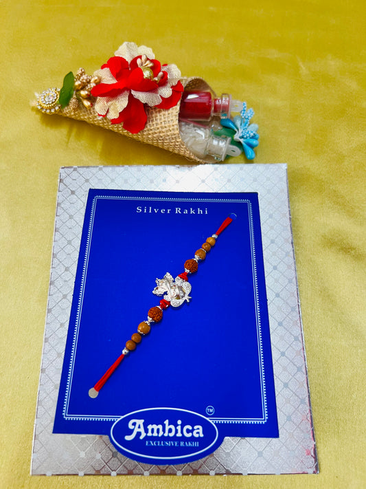 Wrap Shap Designer Rakhi with Silver Polished Ganesh, Beads, and Roli Chawal