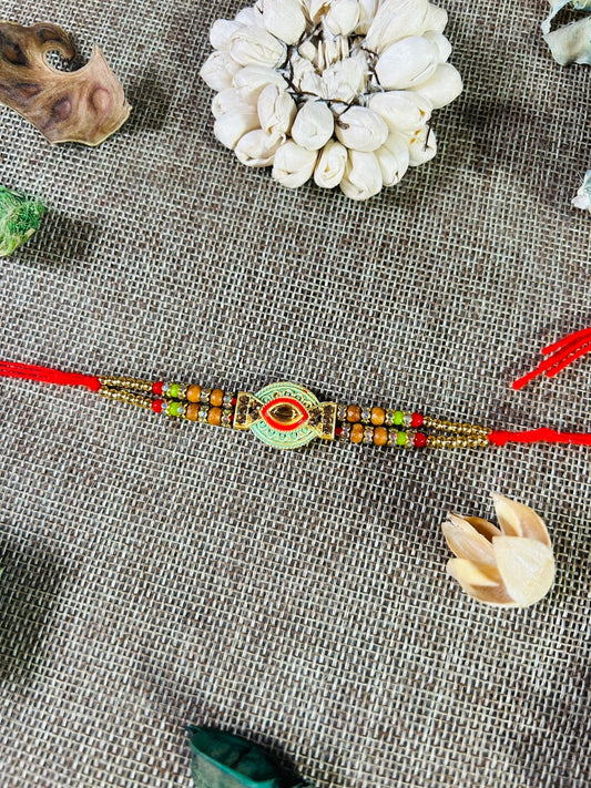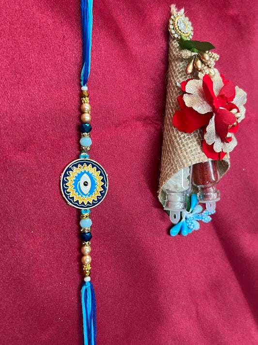 Wrap Shap KG476: Designer Rakhi with Evil Eye Design and Beads, Roli Chawal Included