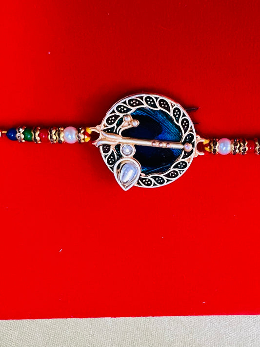 Wrap Shap GG01: Designer Rakhi with Peacock Feather and Krishna Flute Design, Roli Chawal Included