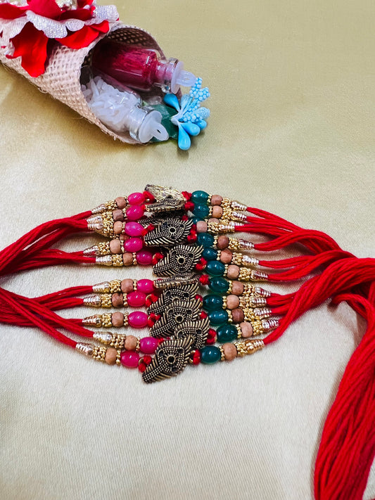 Wrap Shap Om Rakhi with Double Beads - Design CC4, Includes Roli Chawal