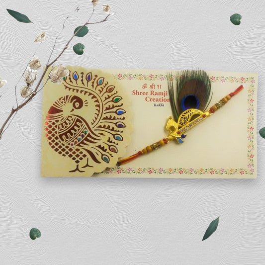 Wrap Shap Morpankh Rakhi with Krishna Bansuri Design - Design EE03, Includes Roli Chawal