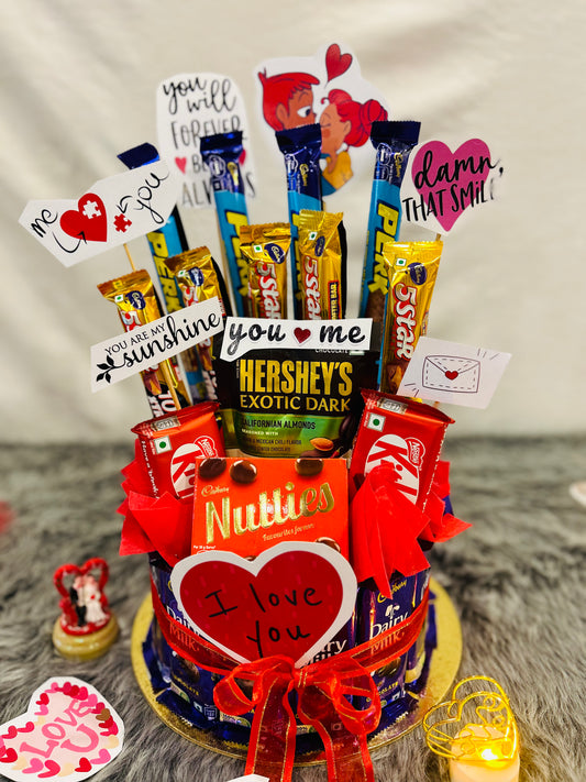 Chocolate Cake Bouquet Hamper with Dairy Milk, Roses & Custom Love Quotes – Perfect for Valentine’s Day, Anniversaries, Birthdays & Weddings