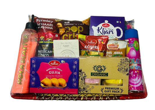Holi Celebration Hamper with Gulal Blaster, Organic Gulal Pack, Snow Spray & Dry Fruit Gujiya | Festive Gift Box