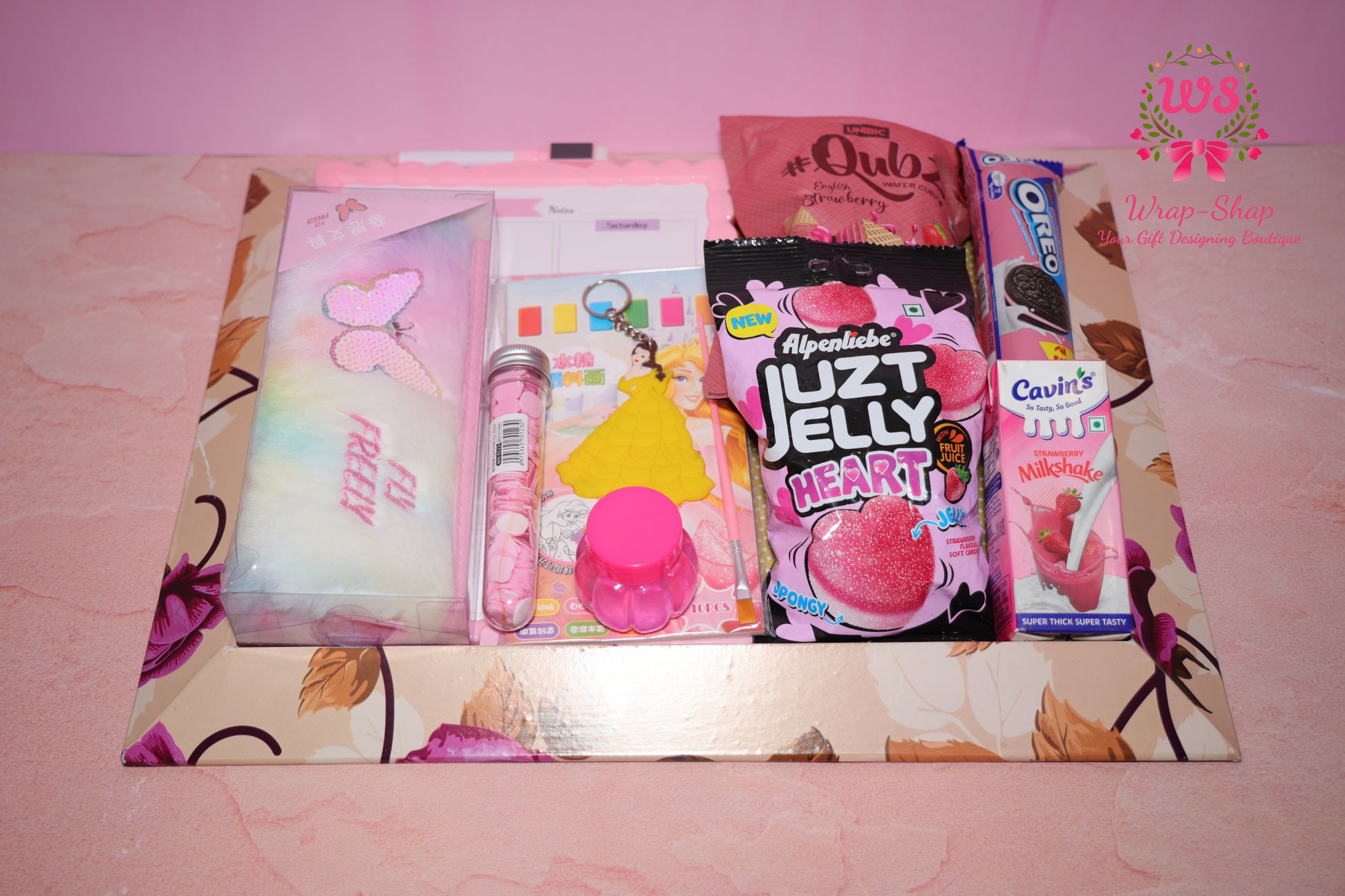 gift hampers for girls, kids birthday hamper India, rakhi gift for little sister, fur pouch gift for child, school farewell gift girls, creative art hamper for kids, cute tray hamper for children, slime and snack box for kids, बच्चों के लिए गिफ्ट ट्रे, ਰਾਖੀ ਰਿਟਰਨ ਗਿਫਟ ਬੱਚੀਆਂ ਲਈ, festival hamper for girls, Christmas gift kids tray, oreo milkshake gift hamper kids