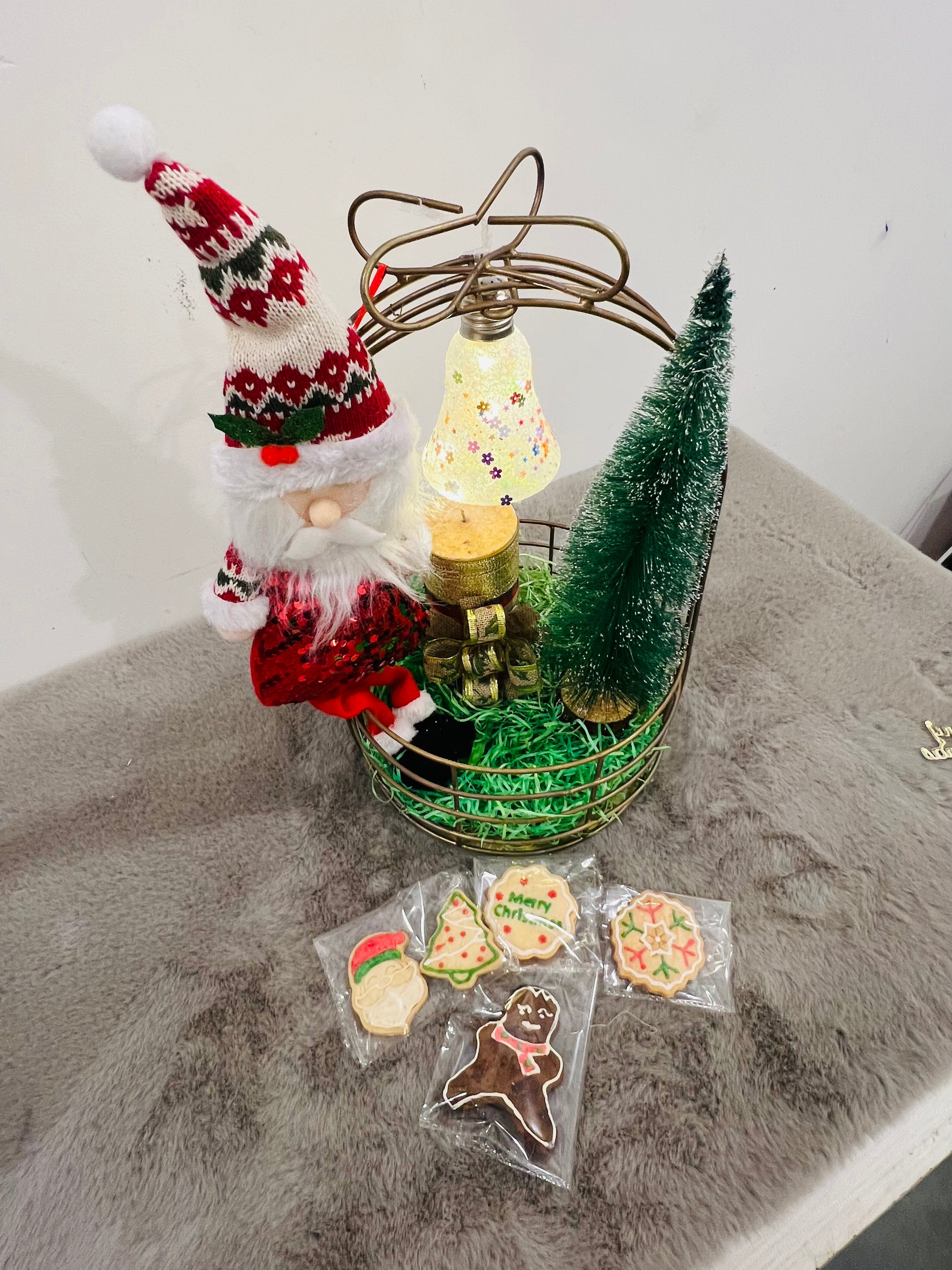 Christmas gift hamper, Xmas-themed cookies gift set, plum cake Christmas treat, scented candle festive gift, classic gingerbread Christmas hamper, tree decorative centerpiece, tree hanging ornament for Christmas, decorated metal basket gift, luxury festive hampers, holiday décor and treats, premium Christmas gifts, corporate holiday gifting, Secret Santa hampers, gourmet Christmas treats, reusable metal basket festive hamper, holiday gifting ideas.