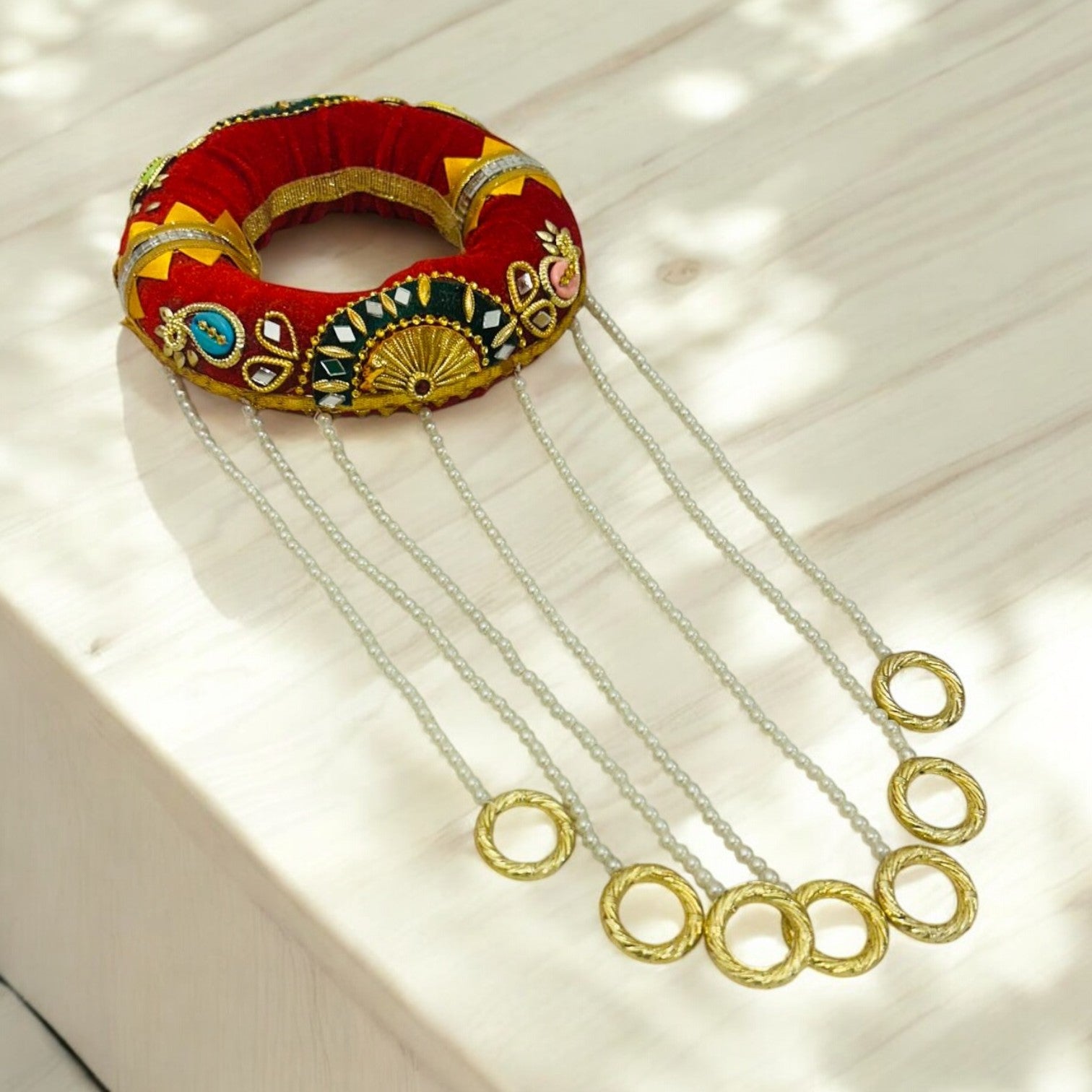 Designed in vibrant colors, traditional fabrics, and adorned with gota or lace work, these head pads help balance the ghara comfortably on the head during ceremonies like Gharoli, Chura, Mayra, and Nimantran. A must-have item for every bride’s or groom’s family during Indian rituals.