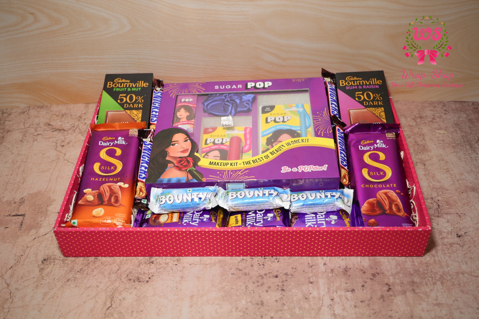Luxury Beauty & Chocolate Gift Hamper for Her with Sugar Pop Makeup Kit, Assorted Chocolates & Scrunchie | Wrap Shap