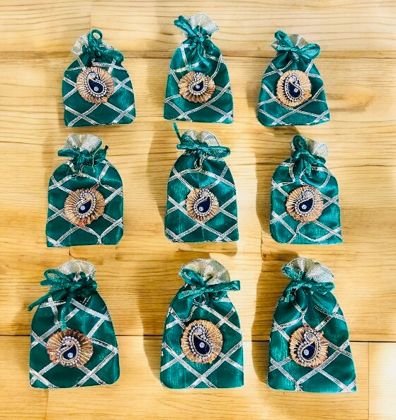 Their premium ethnic look makes them a favourite for wedding return favours, engagement giveaways, Diwali gifting, corporate events, raksha bandhan, baby showers, and temple prasad packaging. With assorted festive colours and a sturdy drawstring closure, these reusable pouches are both beautiful and practical.