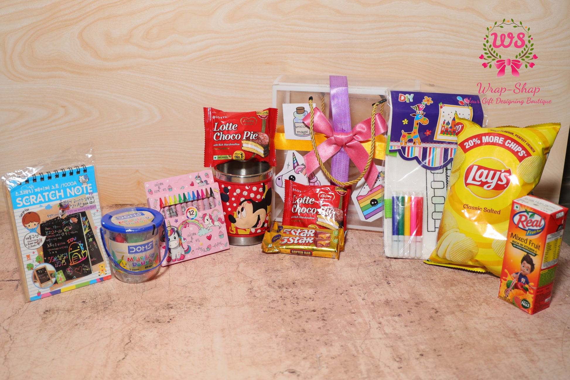 Unicorn Theme Kids Gift Hamper for Girls with Activity Toys, Snacks & DIY Bag in Transparent PVC Bag | Wrap Shap